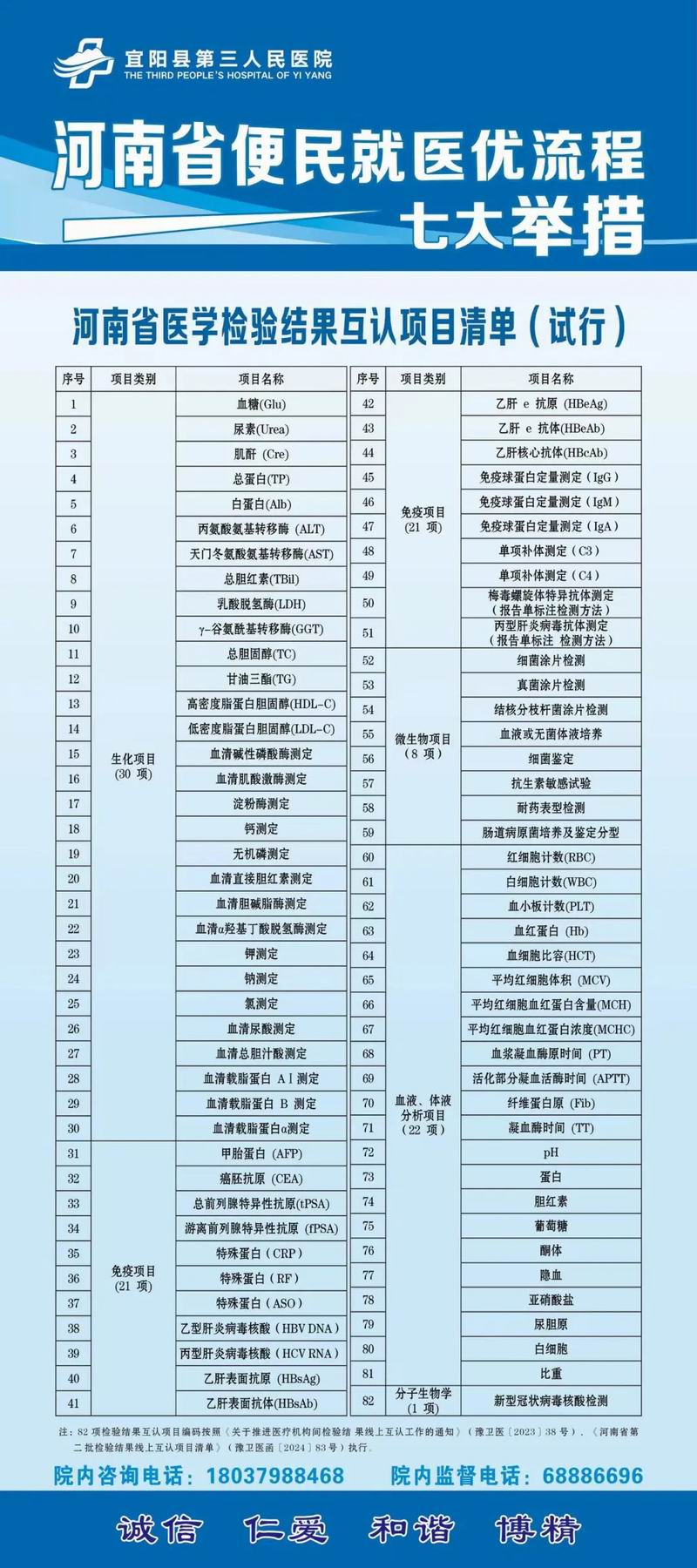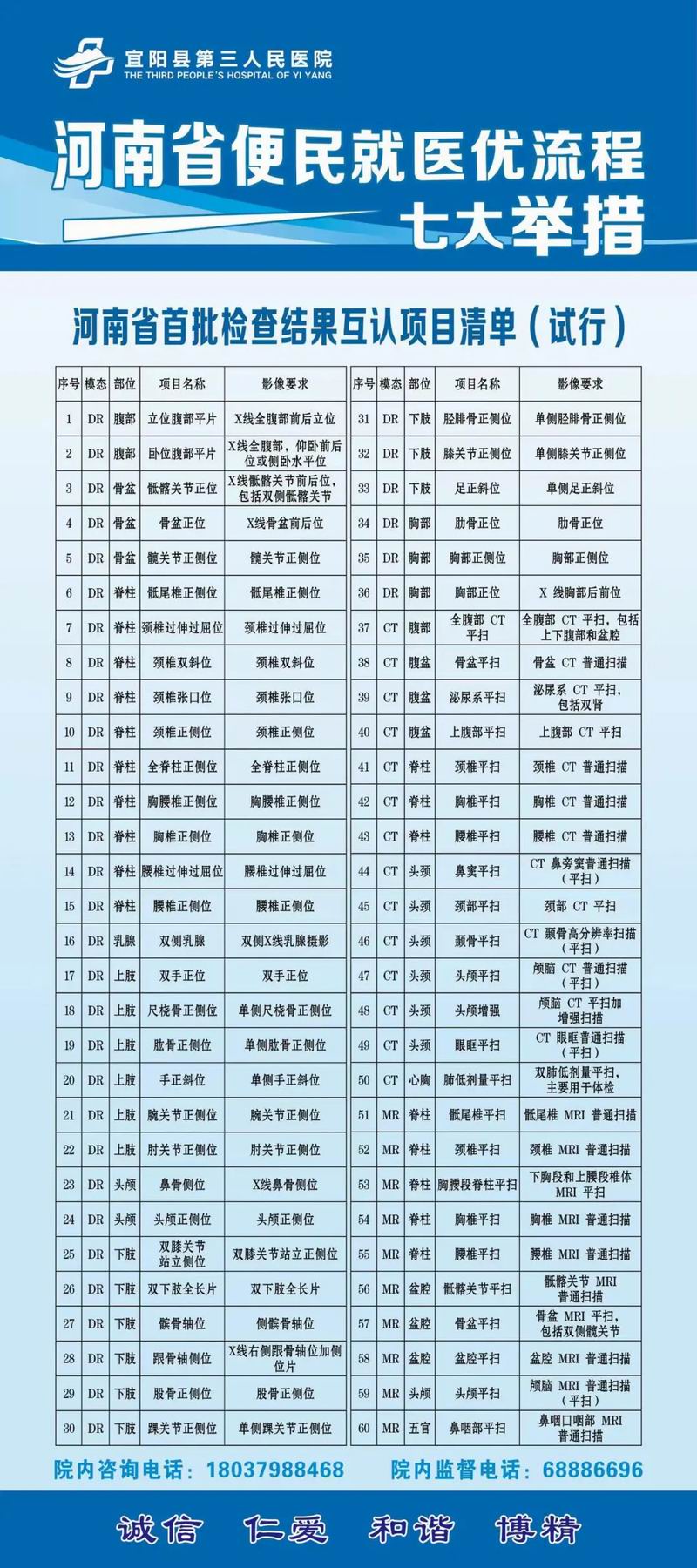 为进一步推进全省检查检验结果互认共享,提高医疗资源利用效率,减轻群众就医负担,改善群众就医体验,宜阳县第三人民医院积极响应国家、省、市县卫生健康委关于推进医疗机构检查检验结果互认的号召,对符合相关标准的检查检验项目实行互认。